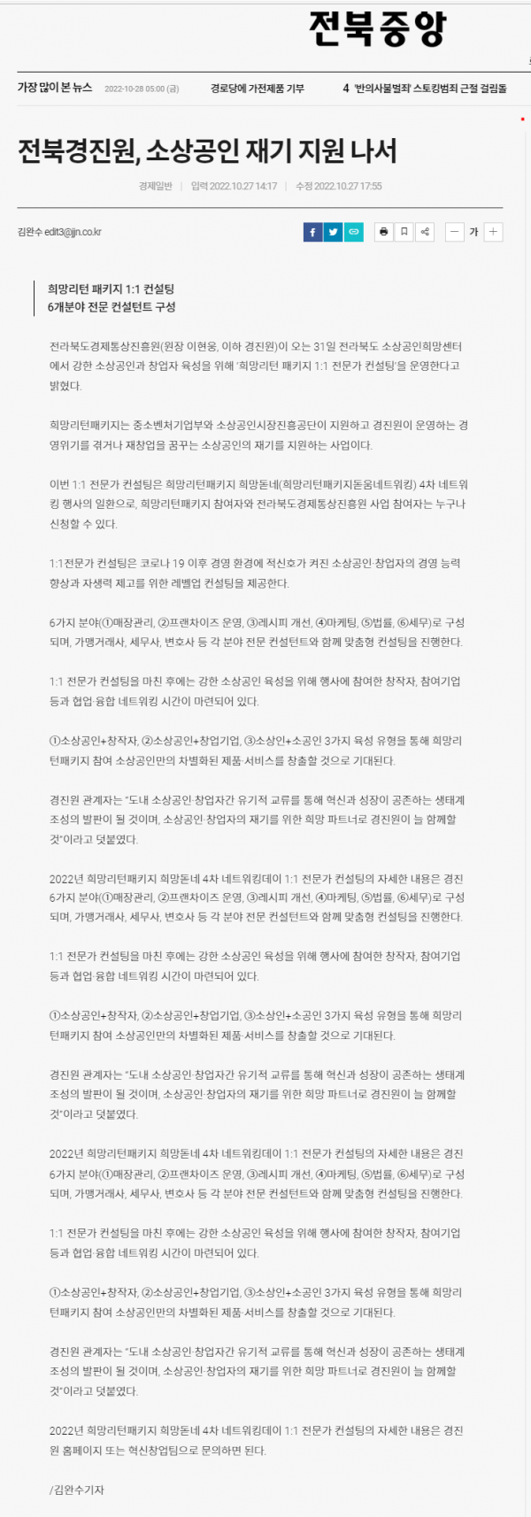 전북경진원, 소상공인 재기 지원 나서 페이지 정보 작성자 희망센터 댓글 0건 조회 5,372회 작성일 22-10-28 10:49 본문 . 목록 이전글도-전북경진원, 소상공인 온라인 판로개척 지원 22.11.08 다음글[제로페이활성화] '15% 할인' 전북제로페이소비쿠폰 2차 발행 22.09.14 댓글목록 댓글목록 등록된 댓글이 없습니다.