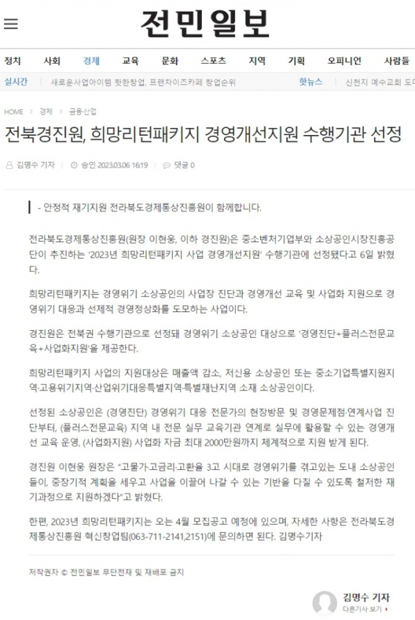 전북경진원, 희망리턴패키지 경영개선지원 수행기관 선정