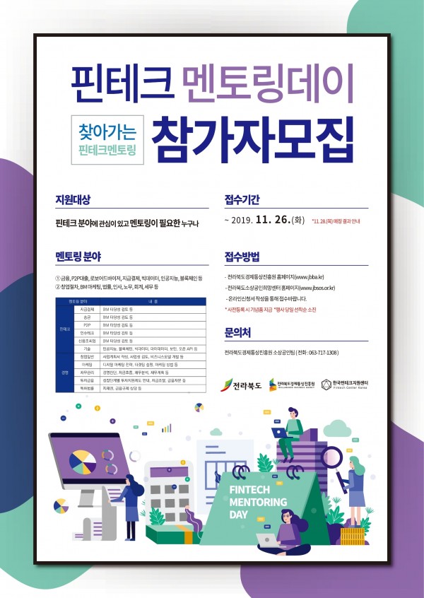 핀테크 분야에 관심이 있고 멘토링이 필요한 누구나 참여가 가능한 핀테크 멘토링데이 진행에따른 참가자를 모집하오니 많은 관심과 참여 부탁드립니다.